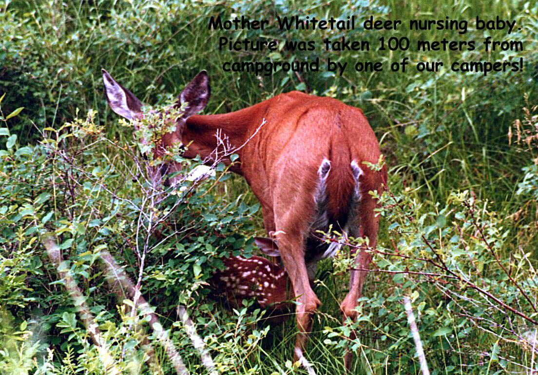This Whitetail doe frequently visits the campground, usually just at dusk. In 2001, she had one baby, and in the summer of 2002, she raised twin fawns! While she is easily startled, quiet, non-threatening movement allows close-up photos like this one. I've copied some great information for you to read, from the web site I've quoted at the bottom of this page.